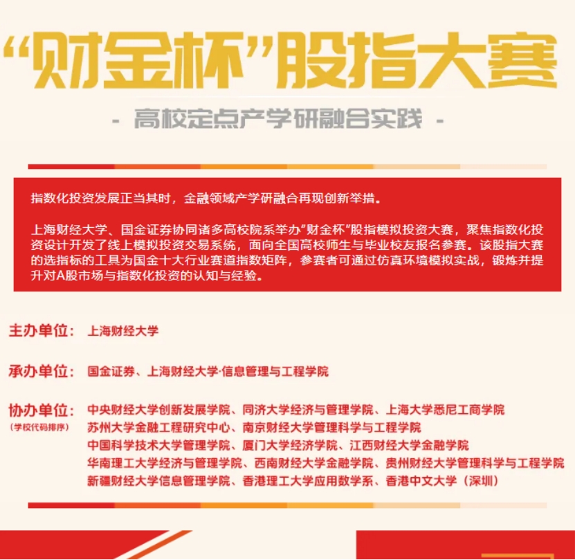 “财金杯”股指模拟投资大赛是金融领域产学研深度融合的一项创新举措。该赛事为全国高校师生及毕业校友提供了一个高度仿真的实践平台,参赛者通过在仿真环境中进行模拟实战,得以锻炼并深化对A股市场及指数化投资的认知与实操经验。