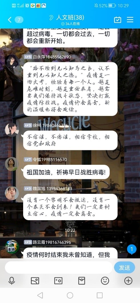在本次开展的“同心共筑梦,青春当有为”团日活动中,2019级工程管理班团支书罗小霞向同学们述说了疫情之下青年作为:“突如其来的疫情现在最重要的是做好个人防护。不出门,少聚集,勤洗手,多通风,口罩带好最关键,同时坚持锻炼身体。疫情来临,我们管科学子临危不惧,积极参与疫情防控工作,在学校做志愿者,做好宣传工作,做到不传谣,不信谣,不造谣,齐心协力,共克时艰。”