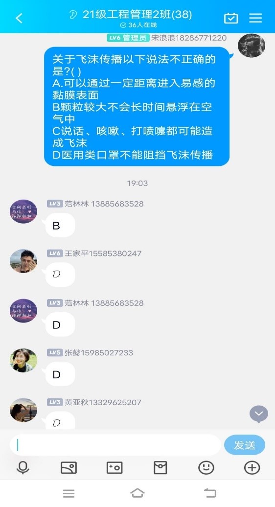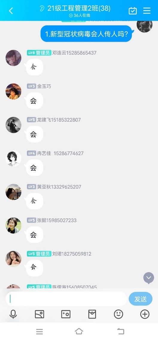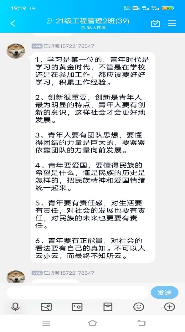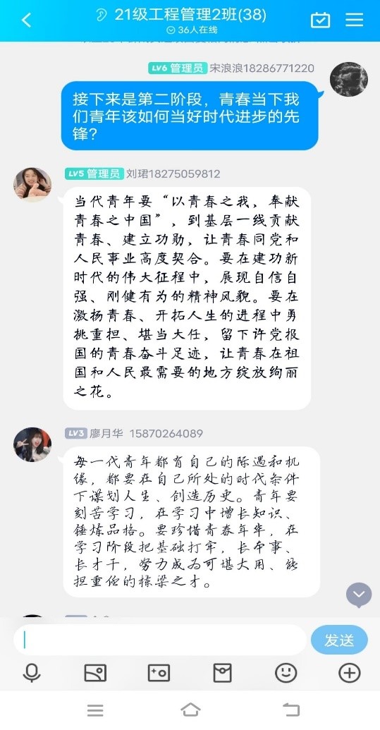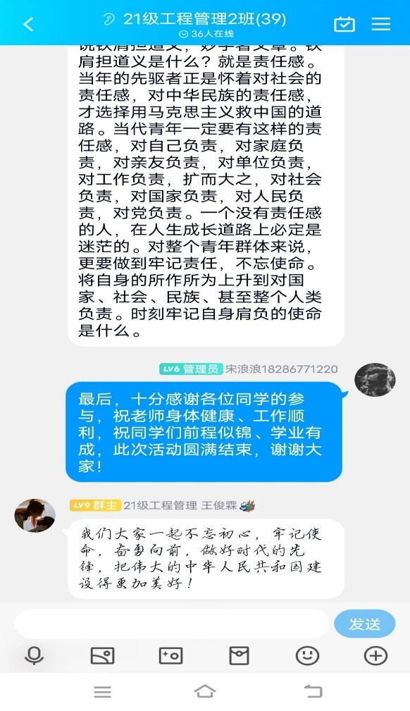 2021级工程管理2班团支书宋浪浪在这次主题团日中利用网络积极开展疫情知识竞答,让团员青年们在疫情防控期间以积极的心态去的面对疫情,学习到防疫相关的知识。接着又让青年团员们思考青春当下的我们该如何当好时代的先锋,同学们经过短暂的思考,积极表达了自己的观点和想法,字里行间都体现着新时代新青年的志气以及对祖国的热爱,相信祖国在这些青年的建设一定会变得更加美好。