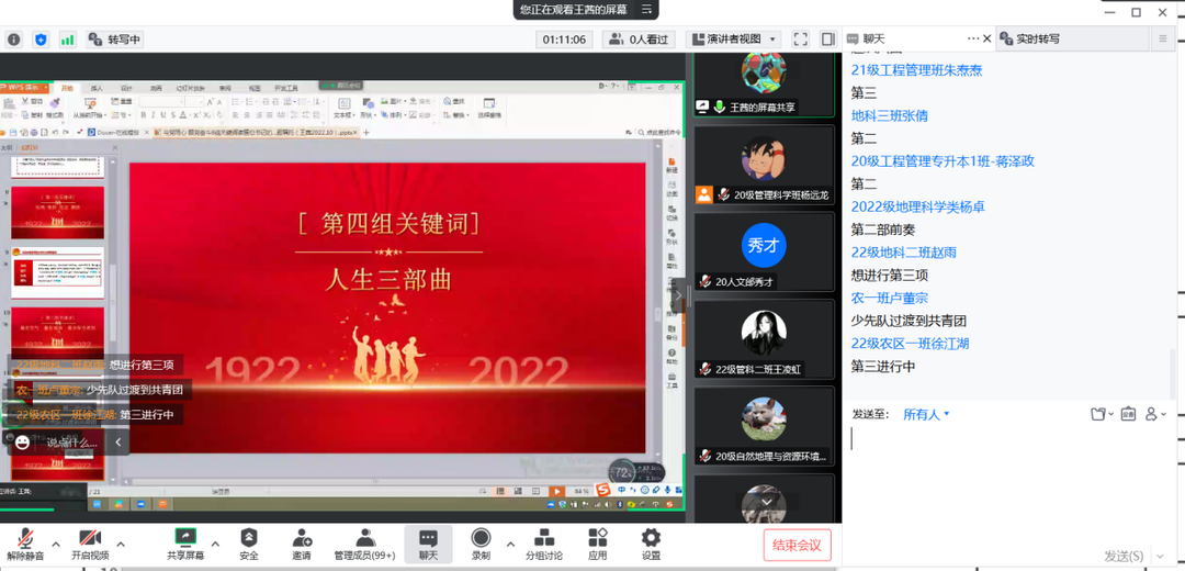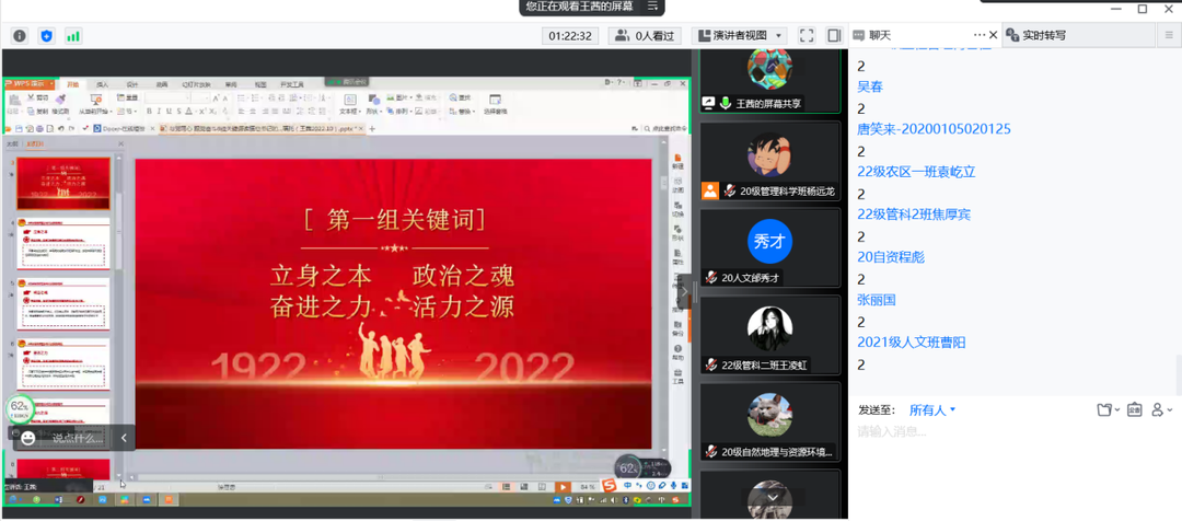 原党委副书记王茜担任主讲嘉宾,与院2022年入团积极分子,院团委学生干部,2020级、2021级、2022级各班级团支部团干及优秀青年共252人一起开展“与党同心 跟党奋斗——六组关键词读懂习近平总书记的殷殷嘱托”第一期主题团课。