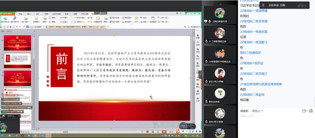 王茜讲解了过去100年来共青团在各个社会时期发挥的重要作用,抗日救亡、组建青年垦荒队、建设四化、在疫情一线披甲冲锋等等能光辉历程,同时强调,百年征程塑造了共青团坚持党的领导的立身之本、坚守理念的政治之魂、投身民族复兴的奋进之力、扎根广大青年的活力之源,一百年来,在党的坚强领导下,共青团不忘初心、牢记使命,走在青年前列,引导青年紧跟党走、跟党奋斗。历史和实践充分证明,中国共青团不愧为中国青年运动的先锋队,不愧为党的忠实助手和可靠后备军。