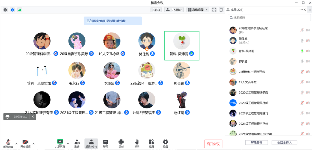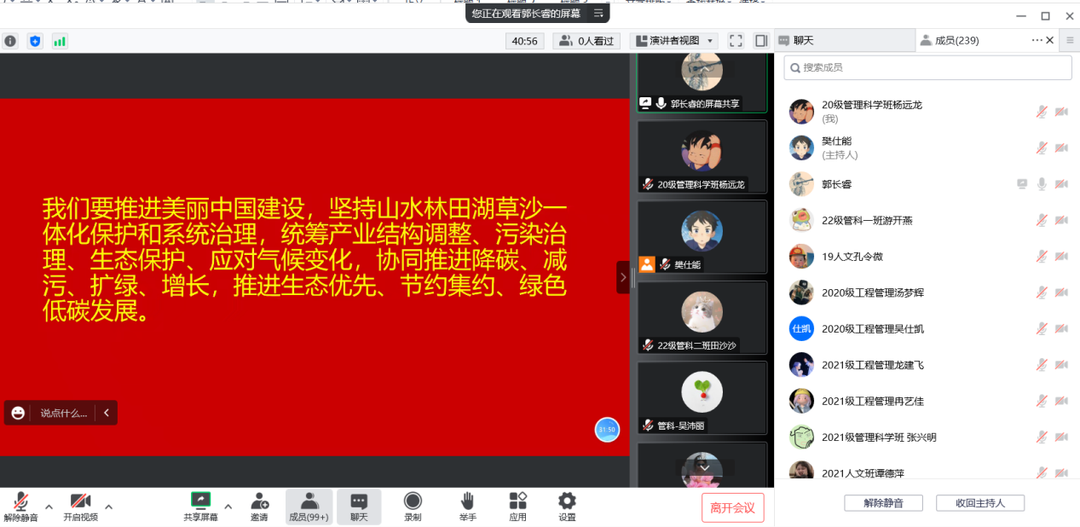 郭长睿向同学们介绍了共青团100年来的使命,同时联系当下讲到新时代团员青年的时代担当,勉励青年团员们要有新时代青年的朝气和抱负,向着未来进发。郭长睿就习近平总书记在二十大报告中提出的“推动绿色发展,促进人与自然和谐共生”这部分内容,联系管科学院的专业,如人文地理与城乡规划、农村区域发展等,启发同学们可以利用所学的专业知识在“坚持山水林田湖草沙一体化保护和系统治理,统筹产业结构调整、污染治理、生态保护、应对气候变化,协同推进降碳、减污、扩绿、增长,推进生态优先、节约集约、绿色低碳发展”这些方面有所作为。郭长睿希望同学们好好学习相关专业知识,在推进美丽中国建设、建设现代化产业体系中贡献自己的力量。
