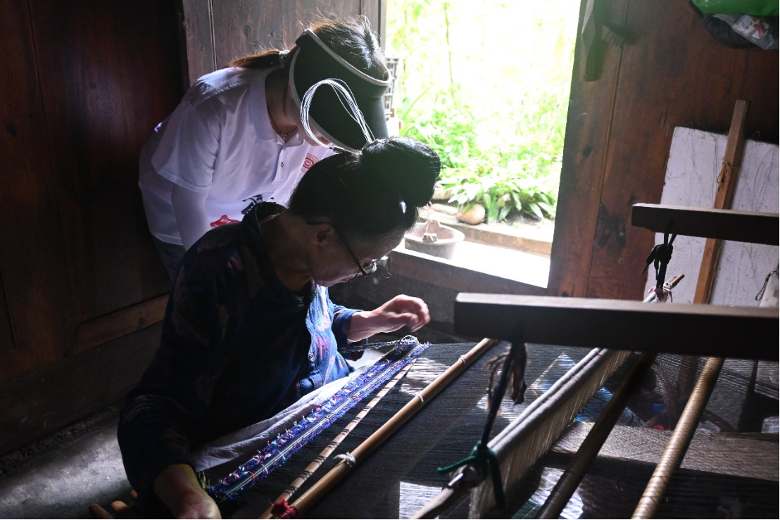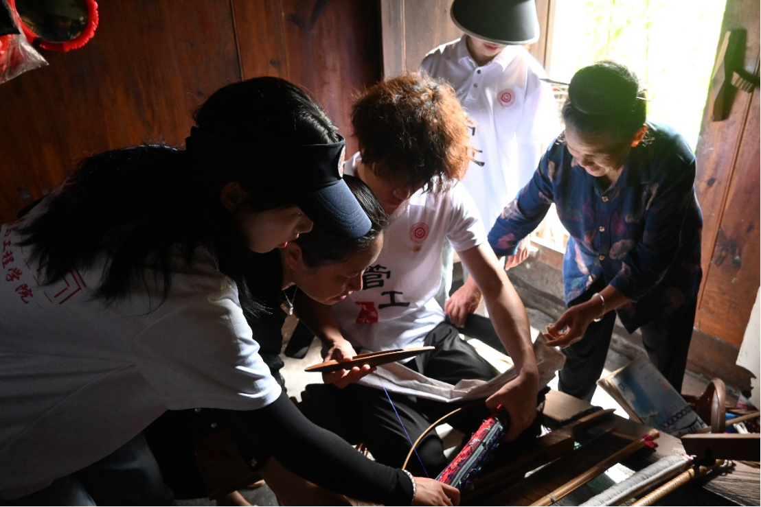 实践团成员首先探访了当地资深织布手工艺者。成员们近距离观摩了传统织布机的精巧构造与操作流程,认真聆听了老手艺人讲述苗族织布技艺的历史沿革与时代变迁。通过亲手实践经纬交织的纺织过程,成员们感受到了传统织布的魅力,增强了文化传承的责任感。