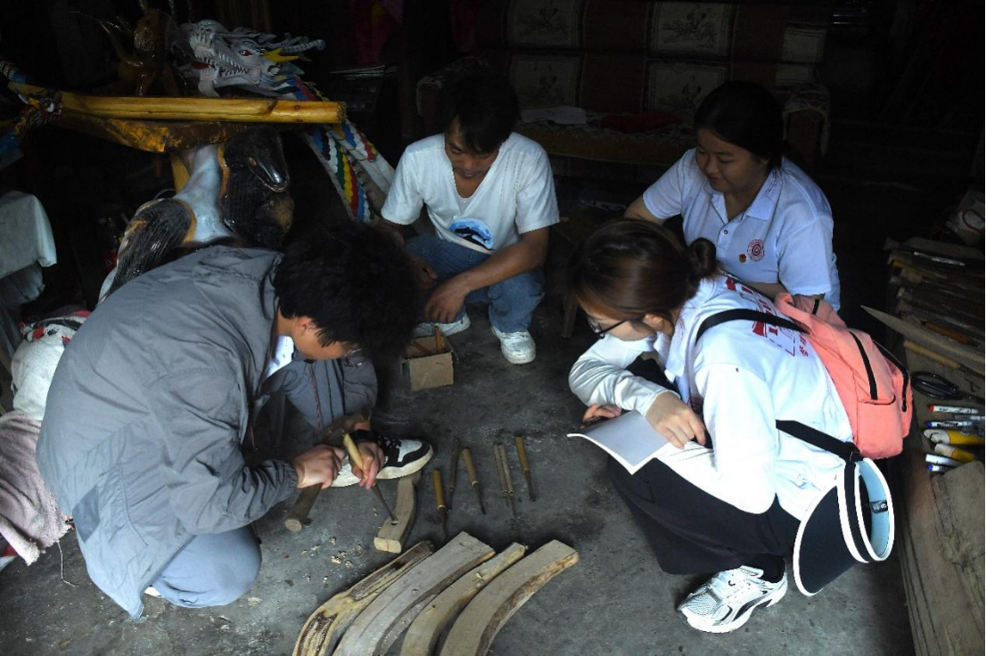 随后,实践团成员走进木雕手艺人的家中,深度探寻木雕技艺的精髓。成员们全程观摩了从选材到雕刻的完整流程,锯木时工具与木料的震颤共鸣、雕刻时刀锋与纹理的专注对话、打磨时砂纸与木材表面的细腻交融,让在场者真切感知到木头蜕变的生命温度。当与老艺人围坐交谈时得知,如今愿静心研习、坚守这份技艺的年轻人已寥若晨星,这份凝结着东方智慧的技艺正面临传承断层的危机。此次探访更坚定了团队成员投身传统手艺传承的决心,大家期盼以青春之力搭建传统与现代的桥梁,让千年木韵在新时代续写传奇。