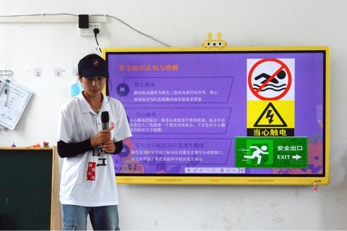 首先是日常安全教育,主要为小朋友们讲解了三个方面的内容:一是安全标识认知,通过“当心触电”、“禁止游泳”“当心滑跌”、“安全出口”等常见标识的讲解,帮助儿童掌握基本安全知识;二是防溺水教育,通过结合“禁止游泳”标识,重点讲解落水求救方法,提升防溺水能力。三是居家安全教育,包括用电、用火等安全隐患防范。