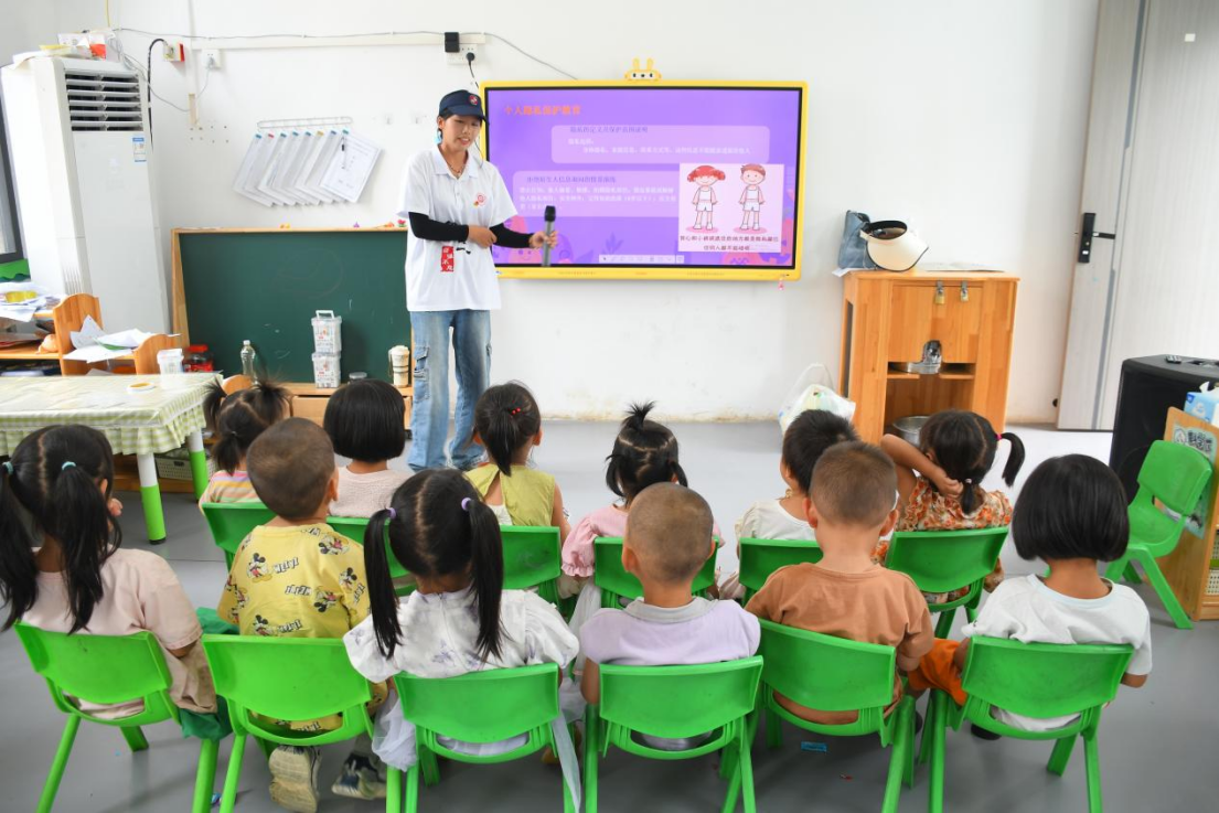 在隐私保护教育环节,队员们通过卡片展示和情景模拟,教导儿童认识隐私部位,学会拒绝陌生人接触,掌握遇到危险时的求助方式。活动最后,实践队对重点知识进行回顾总结,孩子们积极参与互动,现场气氛热烈。
