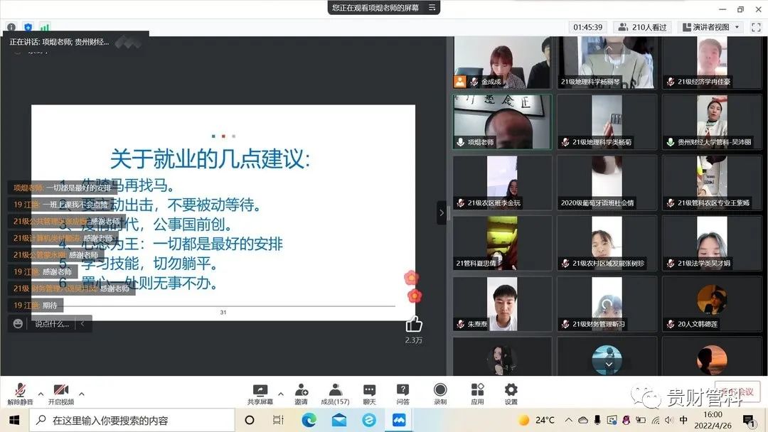 开展“儒魂锻铸”下午茶之本科生学业提升——“抓住面试机遇,掌握求职未来”深度交流活动。此次活动以线上腾讯会议形式开展。特邀贵州仕达培训机构,TTT(国际职业训练协会)认证培训师项焜作为主讲嘉宾,全校200余名学生参与活动。