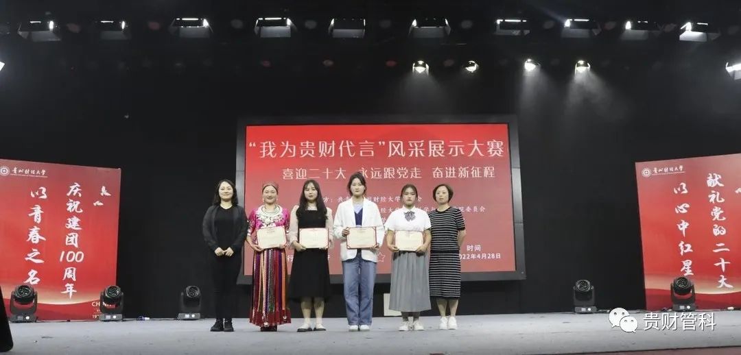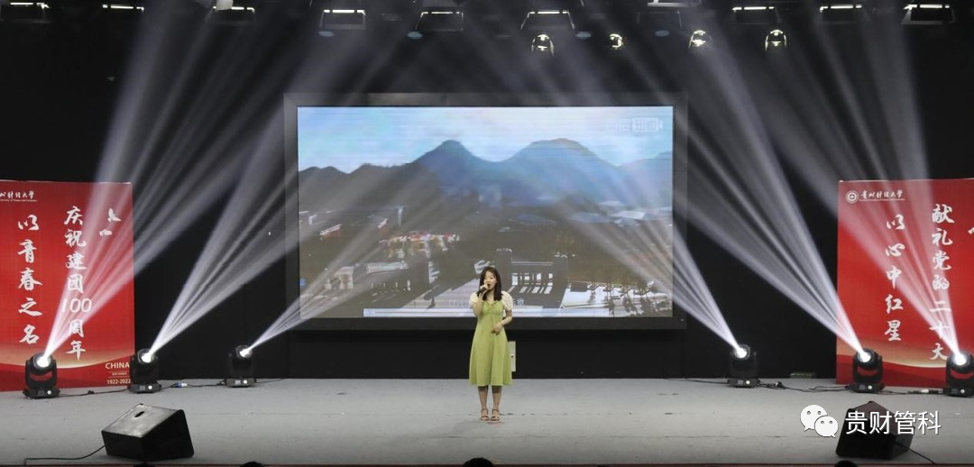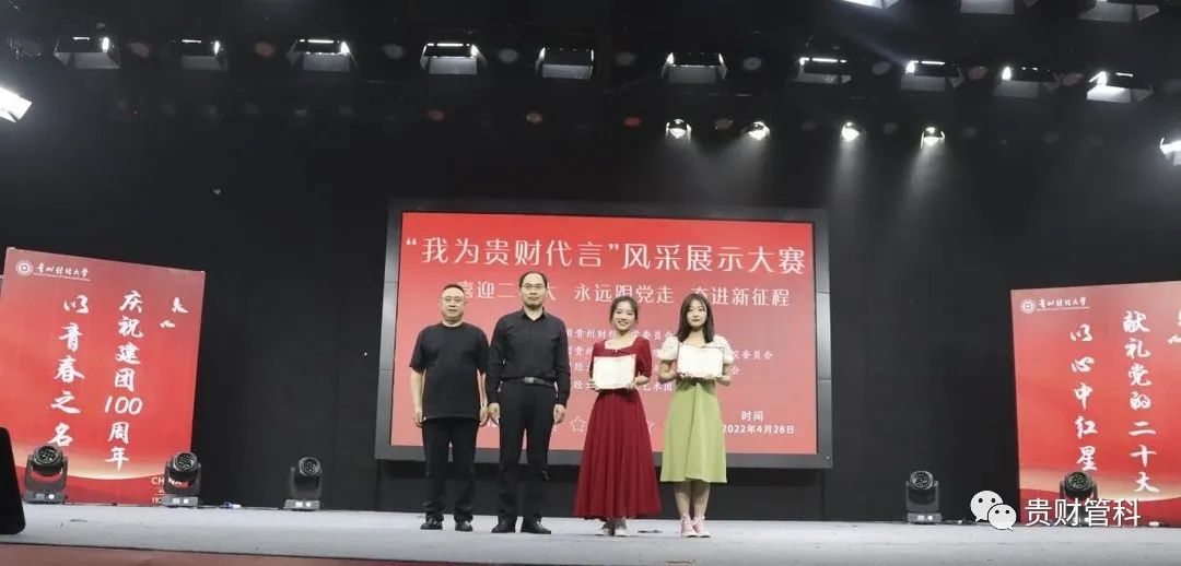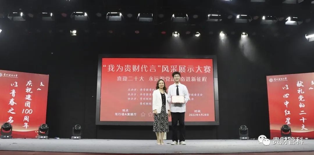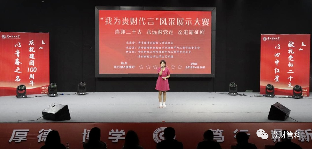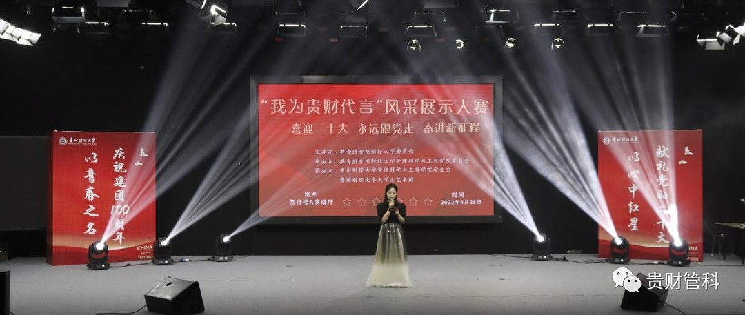 “我为贵财代言”风采展示大赛,参赛选手通过舞蹈、歌曲、朗诵等才艺表演展示个人风采,洋溢着贵财学子的朝气与活力。在“我为贵财代言”展示环节,参赛选手以“带你走进最美贵财”为主题,怀揣对学校的热爱,以饱含深情的言语,慷慨激昂的陈词,落落大方的姿态,深情并茂的介绍了他们心中最美的贵财,讲述了他们与贵财的故事,体现了贵财学子朝气蓬勃、昂扬向上、奋发有为的青春活力和奋进精神。