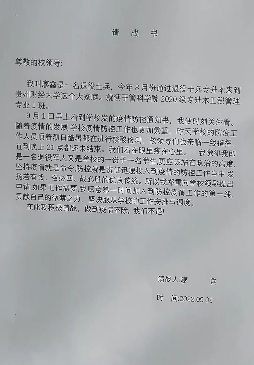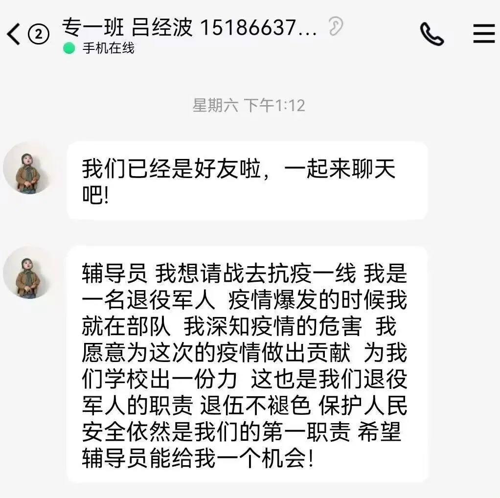 20级专升本吕经波、廖鑫同学,作为曾经的退伍士兵、现在的一名贵财管科新生,向学校学院请战抗疫。