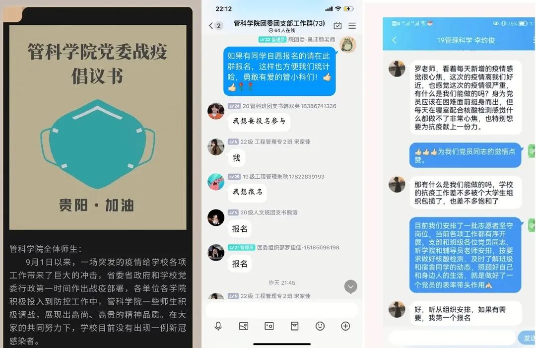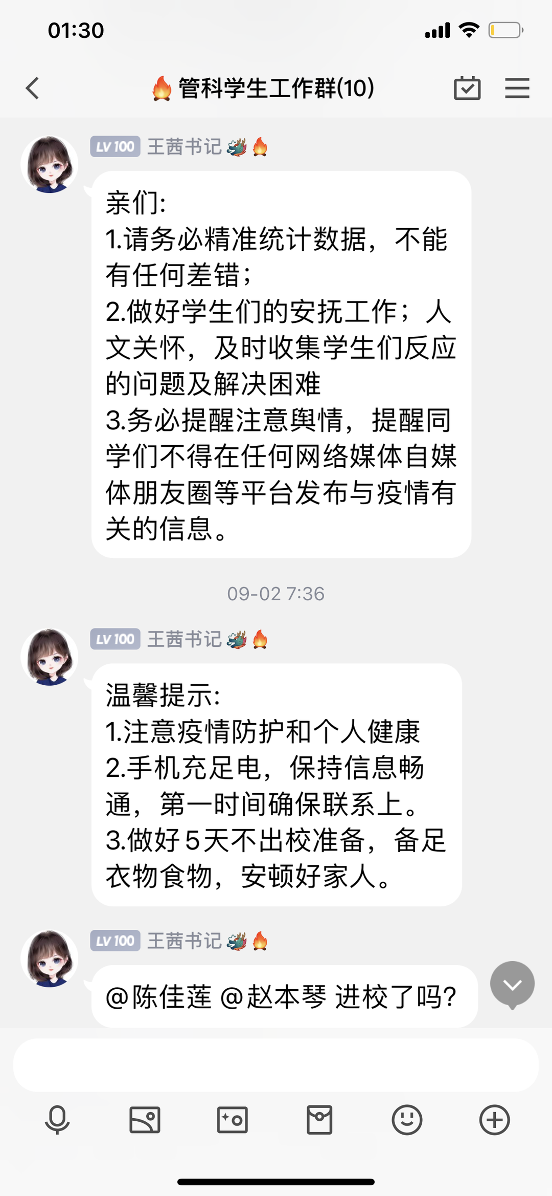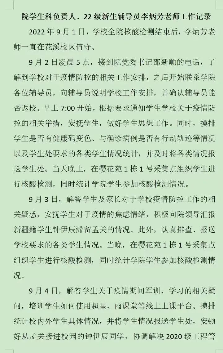 的领导和老师以身作则,挺身而出。9月1日晚至今,管科学院返校到岗的领导老师有党委书记邵新顺、已调往招就处但仍在履行学生管理职责的原党委副书记王茜、学生科负责人李炳芳、专职组织员罗红艳,以及辅导员陈佳莲、姚吟吟、吴德凤、曾建霞(新入职的专任教师)等八名同志按照学校的统一安排部署,展开了所负责点位的全员核酸检测工作,并到学生宿舍走访进行思想政治工作,及时将学校的通知要求传达到学院师生。因静默管理不能到校的辅导员吴沛丽、赵本琴、院办公室副主任赵湘婷、教务科科长朱艳飞在家线上办公,学院党政领导班子其他成员及科室负责同志按照分工共同做好了相关工作。