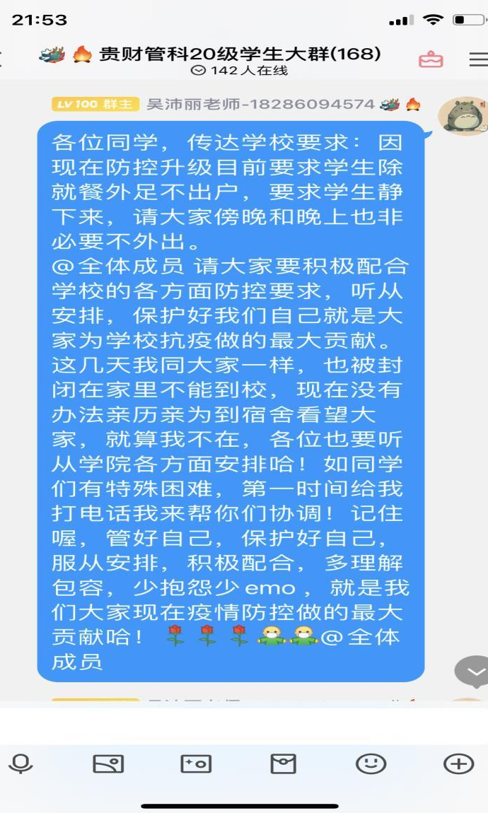 的领导老师们以他们的实际行动给我们管科学子展示了什么是奉献、什么是责任、什么是担当。院党委书记邵新顺每天只睡两三个小时,学院的年轻老师让他多休息时,他嘴边总是挂着那句“没事,你们不用担心,你们小年轻也注意身体”;已调往招就处但仍在履行学生管理职责的原党委副书记王茜,现在仍尽职尽责的和大家一起战斗,并经常给大家带来鼓励温暖,她说过一句话“虽然已经下文我现在不在管科,但是交接工作的最后阶段我仍然要站好最后一班岗,做好自己该做的,有始有终,而且,我对管科也很有感情”;几位辅导员老师家里都是两三岁的孩子,但是他们暂时“放弃”了她们的小孩子,去保护好他们的“大孩子们”。