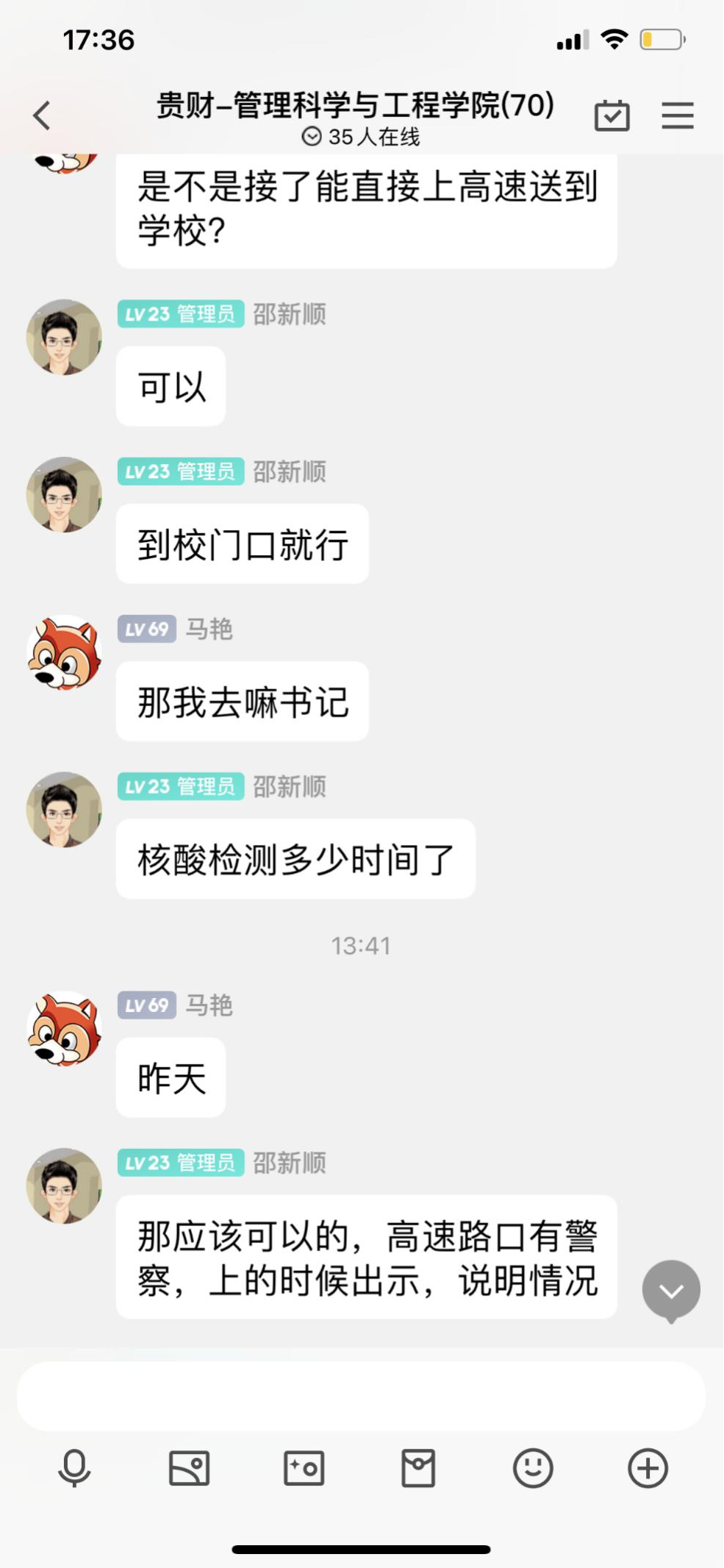 2022级新生韩文鹏同学从青海省出发来校报到,遇疫情防控在四川广元被隔离10天,后因贵阳疫情至今没能进校,在校外漂泊了一月有余。9月26日,经过层层申请与审批,韩文鹏同学终于可以进入校园。但由于贵阳市疫情防控政策,点对点接送韩同学这一工作环节存在很大困难,为此,学院党委书记邵新顺立即号召全院老师根据自身情况,在当前疫情防控政策条件允许下,点对点接送韩同学回校。