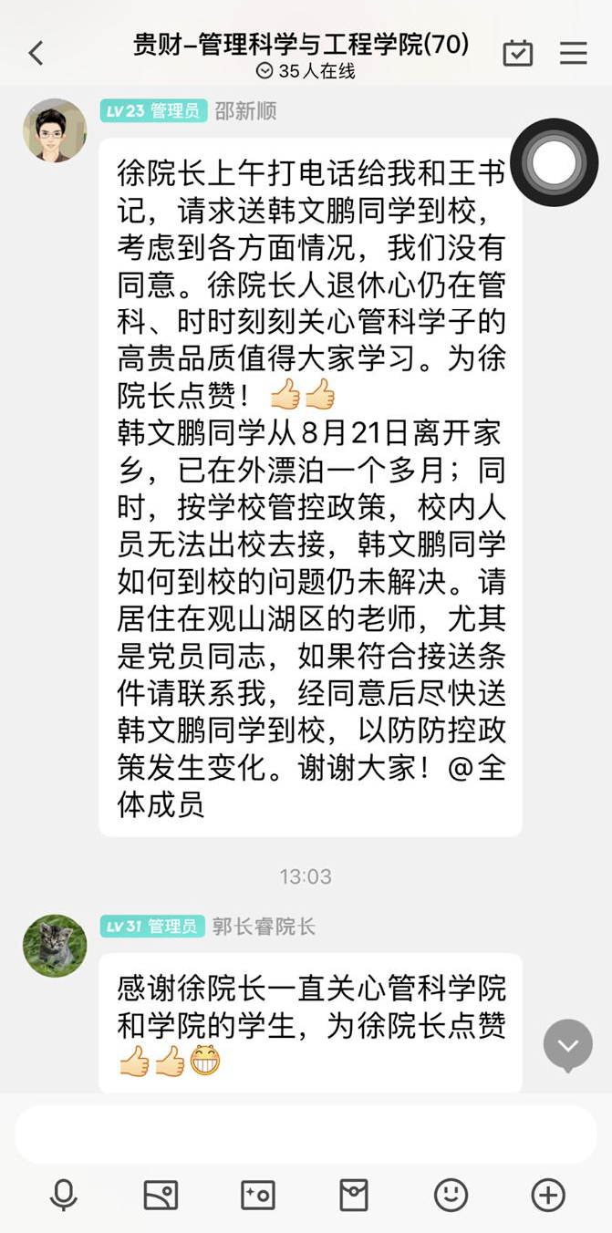 倾情尘世发红豆,化为春雨佛绿杨。凉风习习的秋季,疫情把人们隔离在小小的空间,却没有办法隔断人和人之间的真情。每一位学子都是学院的孩子,面对因疫情滞留校外的管科学子,无论是已退休的徐筑燕院长,还是主动请缨的马艳老师,都是照亮学生前进的红烛,给予学生润物般温暖!“欢迎你回家,韩文鹏同学!”