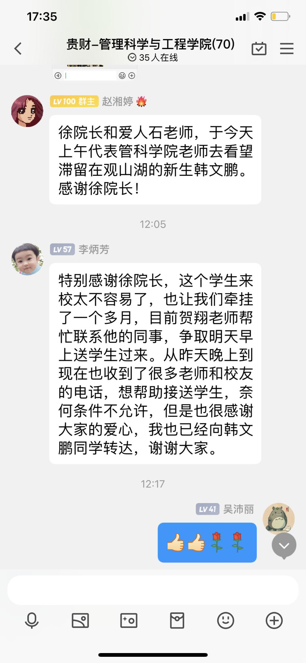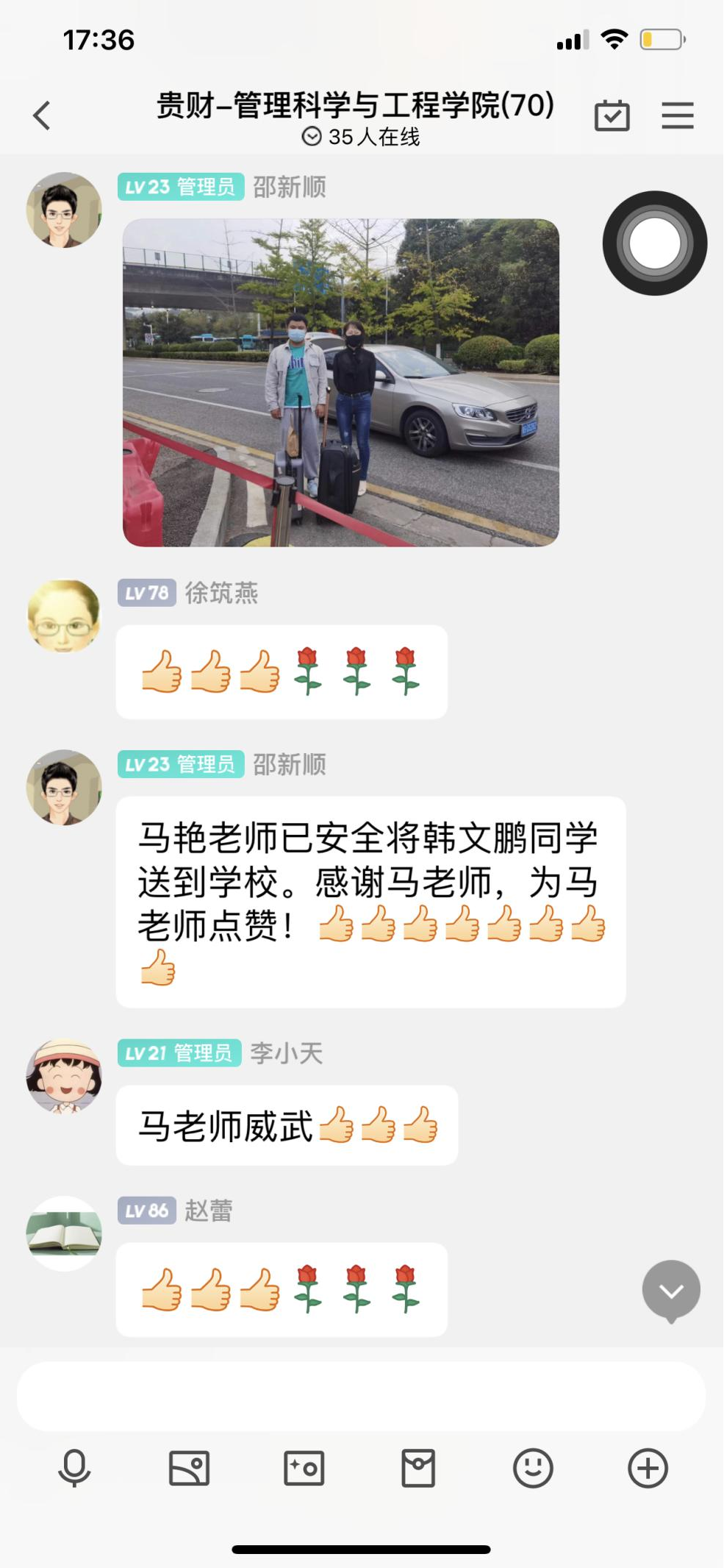 秋风十里,路途遥远,从观山湖到学校的路上,窗外都是明媚的风景。在学院领导老师的关心牵挂下,马艳老师将韩文鹏同学顺利地接送到校园,在外漂泊一月有余的管科学子,终于回到了管科学院温暖的怀抱。