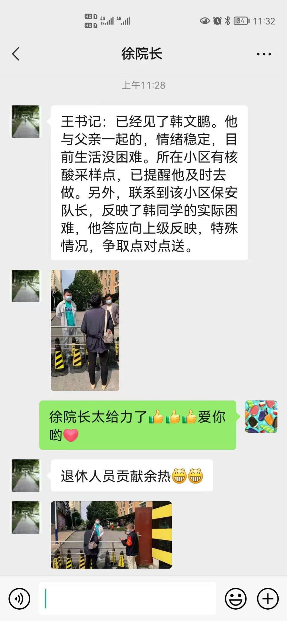 退休不褪色,尽管徐筑燕老师已经退休,但她仍心系管科学院,心一直系在管科学子身上,这支曾经照亮学生前进的红烛依然在默默发着光。对于学院老师的点赞和感谢,徐院长只是轻描淡写地说了一句:“退休人员贡献余热”。有一种爱叫无私奉献,有一种付出叫无怨无悔,有一种情叫春风化雨,虽然韩文鹏同学滞留校外,但学院的领导及老师们一直牵挂着他、关心着他,帮助他度过难关。在这梧桐落叶凉风习的秋季,学院的关心和牵挂,温暖了韩文鹏同学的心灵。