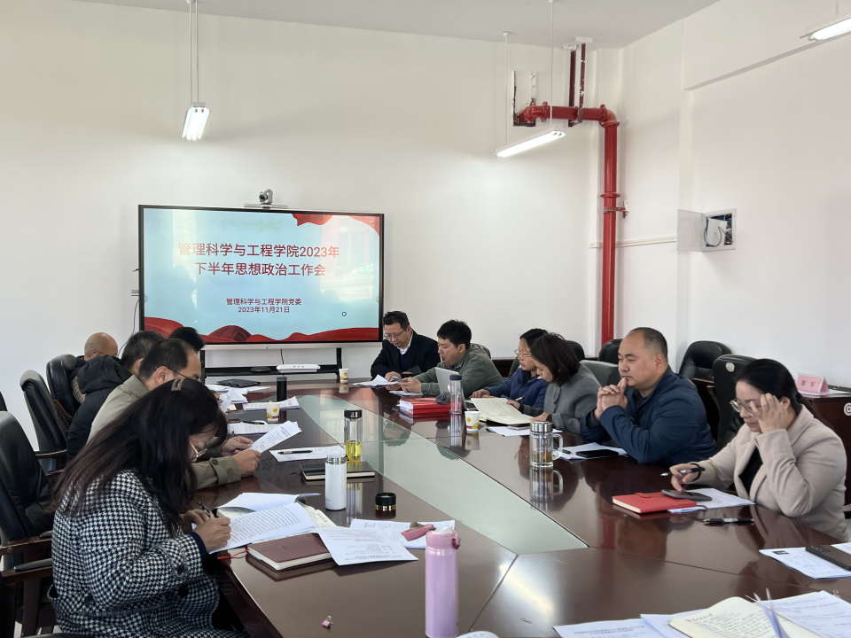 党委在文溯楼509会议室召开2023年度下半年思想政治工作会。学院领导班子成员、全体系(副)主任、科室负责人、党支部书记参加会议,会议由党委书记邵新顺主持。