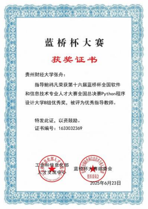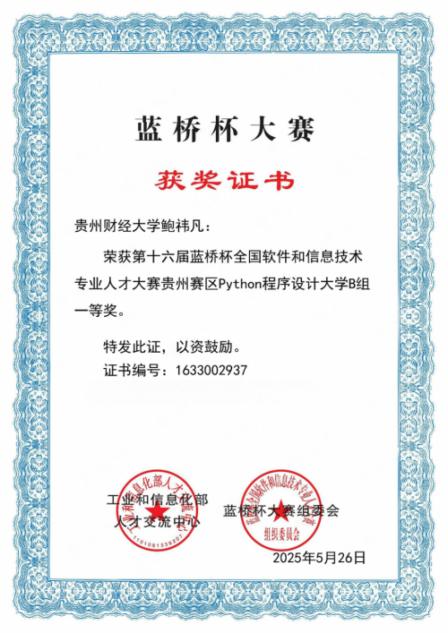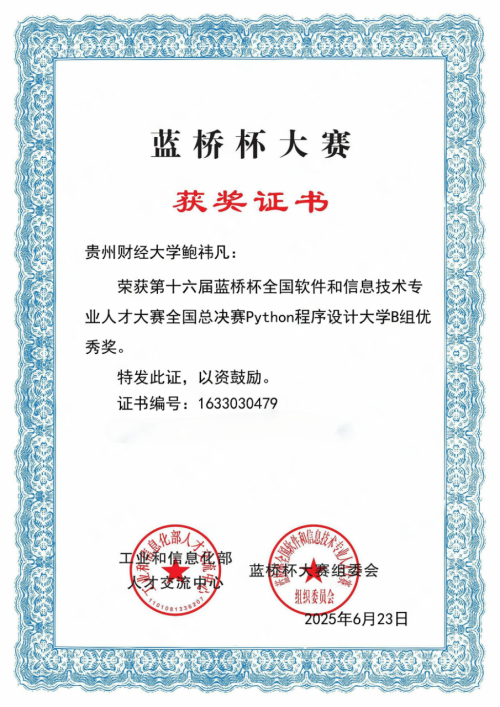近日,第十六届蓝桥杯全国软件和信息技术专业人才大赛电子赛圆满落幕,百合小说 2023级工程管理专业学生鲍祎凡(指导老师:张舟)在斩获佳绩,荣获贵州赛区Python程序设计大学B组一等奖晋级全国总决赛。在高手如云的国赛赛场上,鲍祎凡同学沉着冷静、稳定发挥,经过紧张激烈的比赛,荣获全国总决赛Python程序设计大学B组优秀奖,实现了百合小说 在该赛事上的突破。