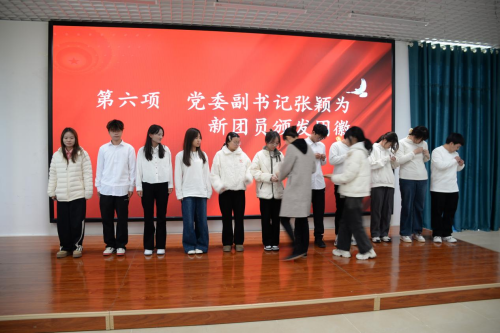 学院党委副书记张颖为新团员逐一颁发并佩戴团徽。金灿灿的团徽佩戴在胸前,既是荣誉的象征,更承载着沉甸甸的政治责任,清晰指引青年学子“听党话、跟党走”的前进方向。